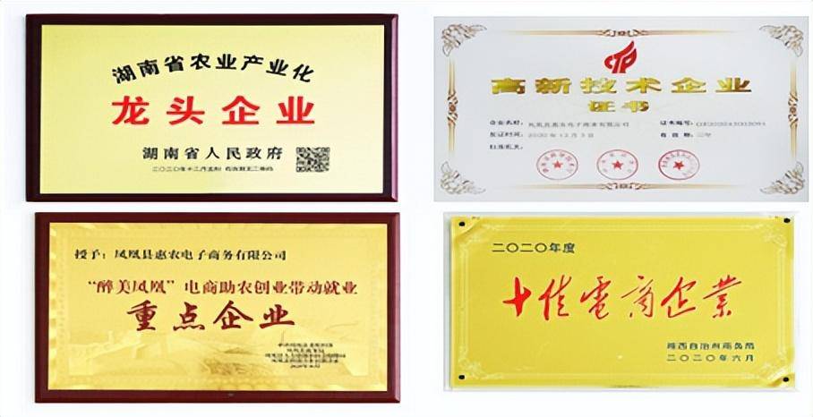 2020 年, 公司獲得湖南省農(nóng)業(yè)龍頭企業(yè) 、湖南省電子商務(wù)企業(yè)、湖南省高新技術(shù)企業(yè)、鳳凰縣電商消費(fèi)扶貧新技術(shù)企業(yè)、鳳凰縣電商消費(fèi)扶貧示范企業(yè)、鳳凰縣電商助農(nóng)就業(yè)帶動(dòng)重點(diǎn)企業(yè)、湘西州十佳電商企業(yè)等榮譽(yù)稱(chēng)號(hào)。