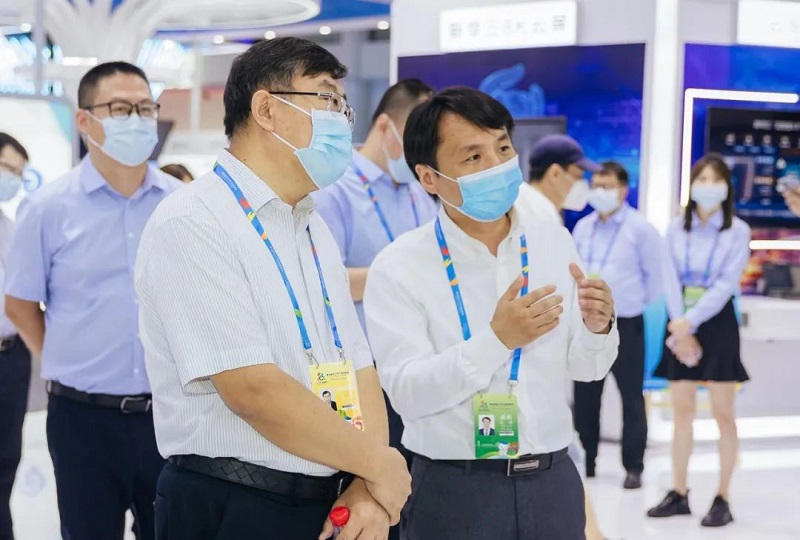 中國(guó)電信集團(tuán)副總經(jīng)理唐珂(左)一行參觀新華三展區(qū),新華三集團(tuán)電信系統(tǒng)部總經(jīng)理李建濤(右)陪同