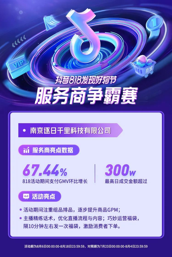 南京逐日千里科技有限公司在活動(dòng)期間幫助商家圍繞大促玩法,重新組品排品,逐步提升商品GPM;精煉直播流程的同時(shí),巧妙運(yùn)營(yíng)福袋,隔10分鐘左右發(fā)一次福袋,激勵(lì)消費(fèi)者下單,活動(dòng)期,幫助商家最高日成交金額超過(guò)300萬(wàn)。