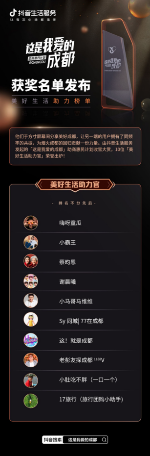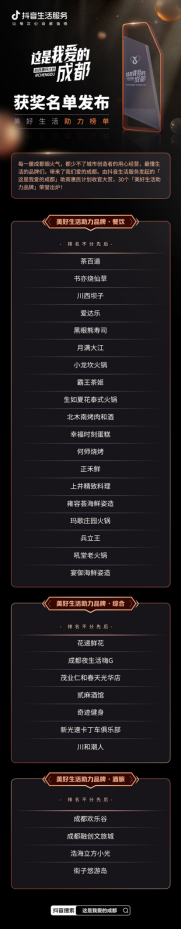 2022年11月4日,由抖音生活服務(wù)發(fā)起的「這是我愛的成都」助商惠民計劃收官大賞,以一場「這是我愛的成都·美好生活助力榜單」榮譽(yù)發(fā)布,對活動期間為成都播撒生活美好的30個品牌和10位達(dá)人做出總結(jié)與嘉獎。