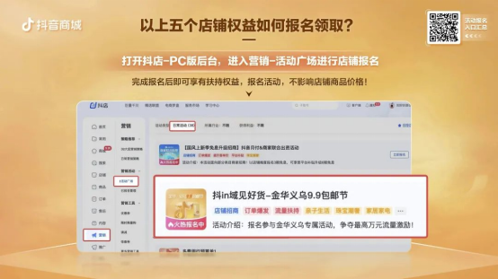 對于已入駐抖音電商且體驗分>4.5的商家,平臺帶來了五大店鋪權(quán)益。商家打開抖店-PC版后臺,進(jìn)入營銷-活動廣場,即可報名領(lǐng)取相關(guān)權(quán)益。
