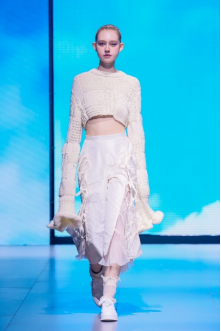 在“童年”主題秀演中,法國設(shè)計師聯(lián)袂浙江懿紗紡織科技有限公司、紹興柯橋豐旺紡織品有限公司,圍繞兒童的藝術(shù)、回到學校、童年的回憶三個子主題,共同演繹了童年的懷舊故事。設(shè)計師以精細的絎縫、印染、明線縫紉及自然著色的效果制作服裝和圖案,在工藝上采用了法國特有的編織技術(shù),并結(jié)合WALTZ系列花紗、三醋酸、錦滌歐根紗、六角硬網(wǎng)等面料輕薄有型、色彩飽滿的特色,最大程度實現(xiàn)了紡織工藝的價值化。特別是在傳統(tǒng)手工藝非遺、生態(tài)環(huán)保材料等系列元素的加持下,為整場秀演增添了可持續(xù)時尚的價值。