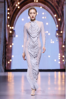 在充滿異域風情的“巴爾米拉女王”主題發(fā)布中,法國高定女裝設(shè)計師JadAdam攜手紹興永耀紡織品有限公司、紹興晶遠創(chuàng)意設(shè)計有限公司展現(xiàn)了尋找內(nèi)心平靜的啟蒙之旅的獨特過程。設(shè)計師從柯橋優(yōu)秀的面料中獲得啟發(fā),在華麗的禮服裙中采用了大量的刺繡及繡片繡珠工藝。兩家企業(yè)提供的閃光高密度歐根紗、銀色金屬絲、清透網(wǎng)眼等面料,花型立體簡潔、色彩透亮多變,為設(shè)計師帶來了豐富的靈感。從晚禮服、婚紗到高級時裝,JadAdam通過特有的藝術(shù)表現(xiàn)手法詮釋了本次禮服設(shè)計。