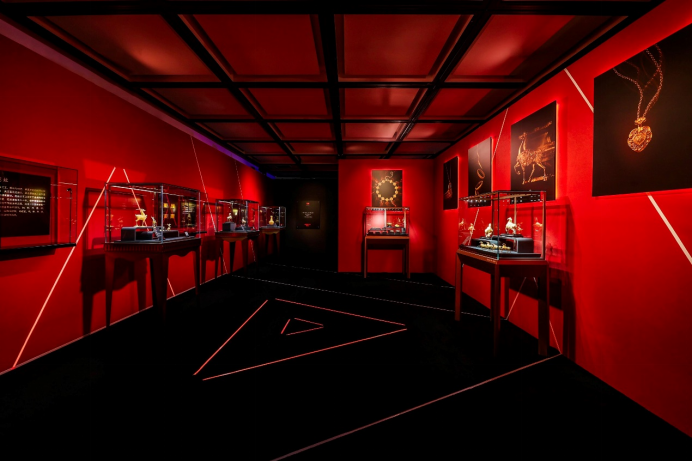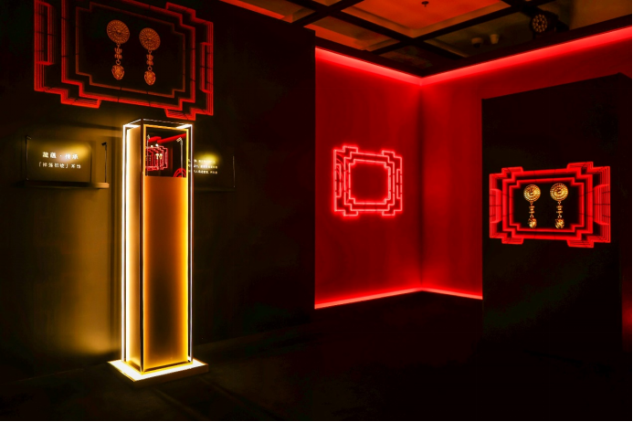 博大精深的中國傳統(tǒng)文化孕育出無限創(chuàng)造力和想象力,因此周大福珠寶集團(tuán)在探索珠寶美學(xué)與中國傳統(tǒng)文化相結(jié)合的過程中不斷推陳出新,呈獻(xiàn)許多匠心獨運的藝術(shù)臻品——標(biāo)志性的周大福傳承系列作品。此次GOLD IS CHIC鎏光時代·周大福傳承系列黃金美學(xué)藝術(shù)展跨越時空界限,將蘊含歷史、文化的黃金美學(xué)呈現(xiàn)到大眾視野中,全方面展現(xiàn)黃金珠寶設(shè)計背后的時尚創(chuàng)意靈感、精益求精的工藝和具有東方韻味的藝術(shù)美學(xué)理念。此次展覽的空間設(shè)計從周大福傳承系列視覺大片中汲取靈感,衍生出紅黑金三色、光影不斷變換、又極富想象力的三個空間,以創(chuàng)新的藝術(shù)視角展現(xiàn)品牌具有中國傳統(tǒng)文化內(nèi)涵的時尚潮流形象。置身于展覽空間,映入眼簾的是霓虹線條與迷離燈光相互交織而成的“時光隧道”,使人仿佛置身于過去與未來的交界地。光影流動的變幻間,映照出品牌歷經(jīng)歲月沉淀后的璀璨輝煌,這意味著品牌正開啟黃金世代的嶄新篇章。