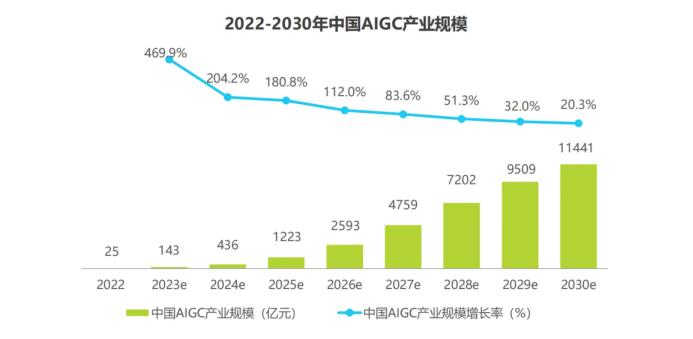 報告指出,2023年中國AIGC產(chǎn)業(yè)規(guī)模約為143億元,隨后進入大模型培育期,持續(xù)打造與完善底層算力基建、大模型商店平臺等新型基礎(chǔ)設(shè)施,以此孕育成熟技術(shù)與產(chǎn)品形態(tài)并將其對外輸出。到2030年中國AIGC產(chǎn)業(yè)規(guī)模有望突破萬億元,達到11441億元。
