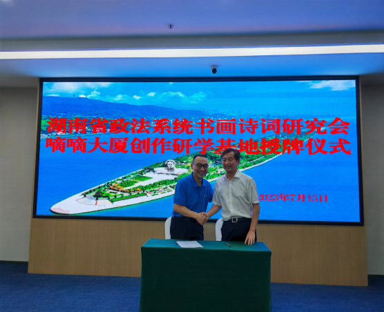 儀式現場,陳嶺主席與湖南嘀嘀大酒店董事長喻熟東簽約,標志著“湖南省政法文化嘀嘀大廈創(chuàng)研基地”正式成立。隨后,在眾位嘉賓的共同見證下,彭對喜、劉慶富、陳嶺、喻熟東為創(chuàng)作研學基地揭牌。