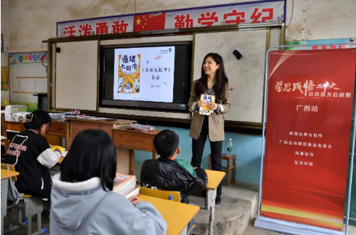 4月25日下午,“學思踐悟二十大 投教服務校園行”在浦北縣三合鎮(zhèn)橋頭小學開展。深交所、海通證券投教基地的專業(yè)人員深入各個班級進行少兒財商授課,借助由深交所投資者服務部編著的《漫話大股市》,將專業(yè)的財經內容以通俗易懂的圖文形式傳授給小朋友們?!肮镜降资鞘裁?”“公司上市又是什么?”“有限責任公司與股份有限公司的區(qū)別在哪?”……一顆顆財商的種子在孩子們的心中生根發(fā)芽。