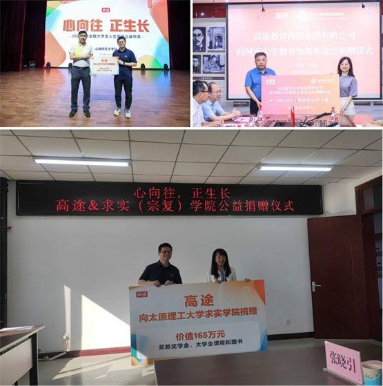 為幫助引導(dǎo)當(dāng)代大學(xué)生樹(shù)立正確的學(xué)習(xí)觀和就業(yè)觀,增強(qiáng)職業(yè)生涯規(guī)劃意識(shí),培養(yǎng)創(chuàng)新創(chuàng)業(yè)思維,保持奮發(fā)昂揚(yáng)向上的精神狀態(tài)。6月12日到15日,高途先后向山西師范大學(xué)、太原理工大學(xué)、河南大學(xué)、武漢理工大學(xué)四所大學(xué)捐贈(zèng)了總價(jià)值超過(guò)600萬(wàn)元的課程書(shū)和書(shū)籍,支持在校大學(xué)生學(xué)習(xí)提升。同時(shí)高途在山西師范大學(xué)、太原理工大學(xué)設(shè)立了連續(xù)三年的“獎(jiǎng)教獎(jiǎng)學(xué)金”,用于獎(jiǎng)勵(lì)有突出貢獻(xiàn)的教學(xué)項(xiàng)目和表現(xiàn)優(yōu)異的在校大學(xué)生。