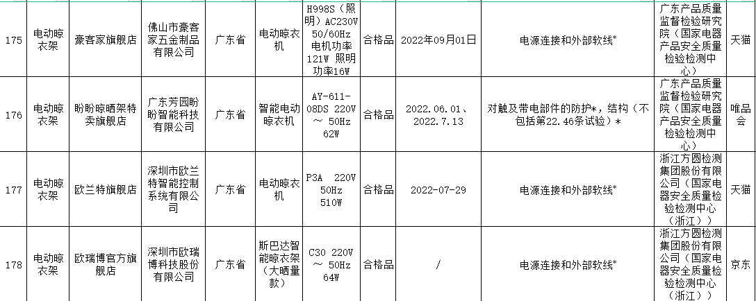 本次電動晾衣架抽查檢驗9個省(市)48家企業(yè)生產(chǎn)的52批次產(chǎn)品,包括天貓、京東、拼多多、抖音等電子商務(wù)平臺,發(fā)現(xiàn)24批次產(chǎn)品不合格,涉及卡瑞琪(courage)、顧家、格峰、盼盼、歐蘭特等品牌。